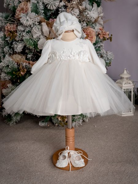 Compleul din 3 piese “Simina” este format din rochie, bentiță și papucei, confecționate din voal ivoire 100% poliacril cu aplicații din dantelă din mătase brodată pe tull.