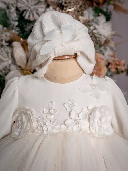 Compleul “Tiela-Alb” este compus din rochie, turban din lâniță tricotata și botoșei asortați.