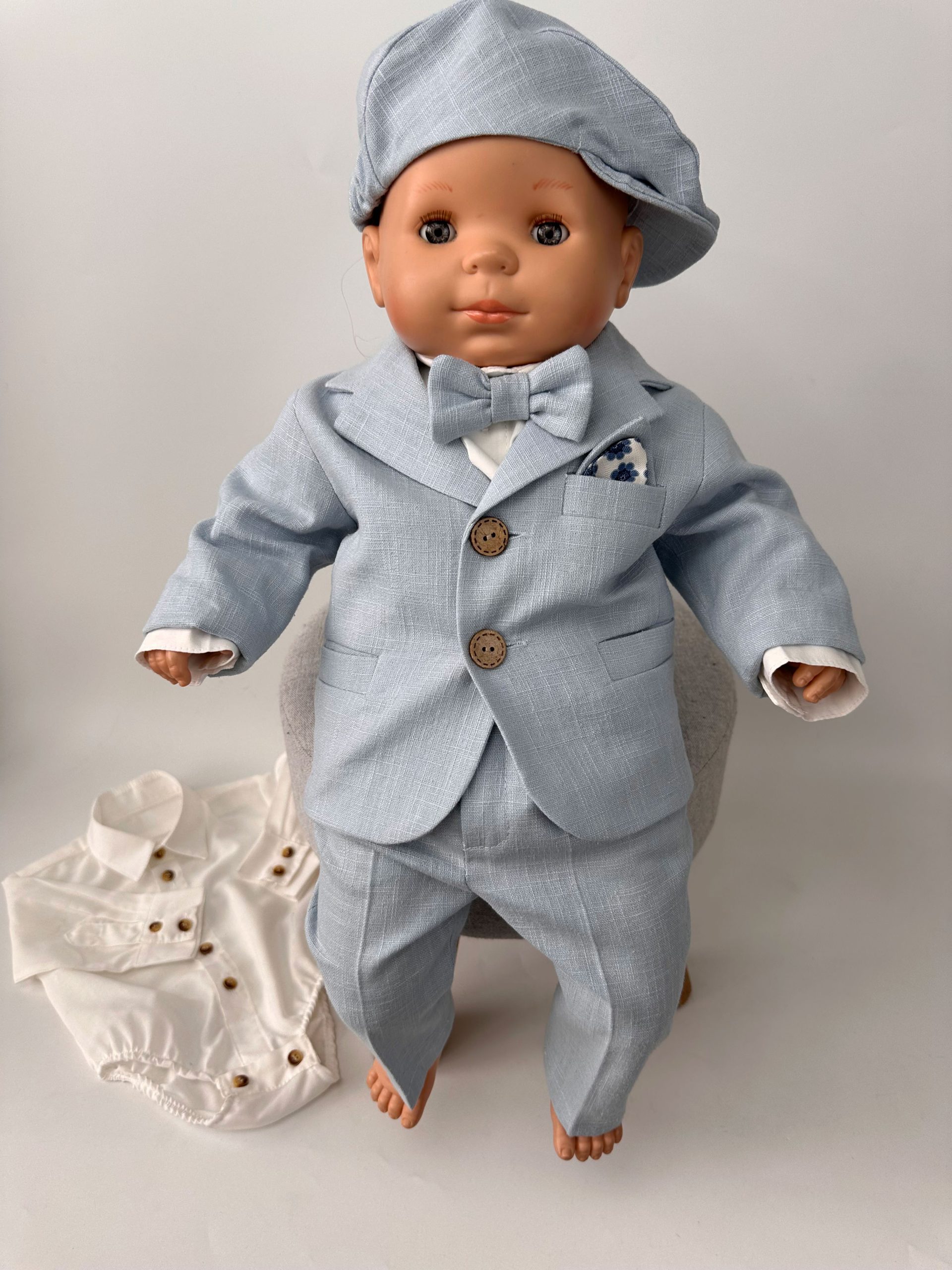 Eleganță pură într-un costum de botez din in bleu premium, compus din 5 piese atent lucrate.