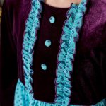 Rochia Irma este confecționată din catifea elastică (100% poliacril), combinată cu voal (poliacril) turcoise cu buline mov.