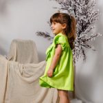 Rochia “Liana” este confecționată din bumbac galben cu buline albe, având cordon pentru reglarea taliei și închizându-se cu fermoar la spate.