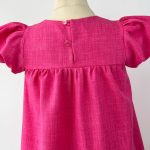 Salopeta este din in, cu volane din in și bumbac și nasturi îmbrăcați, cu elastic pe părți, iar închiderea și reglarea lungimii se face cu ajutorul fundițelor de pe umăr.