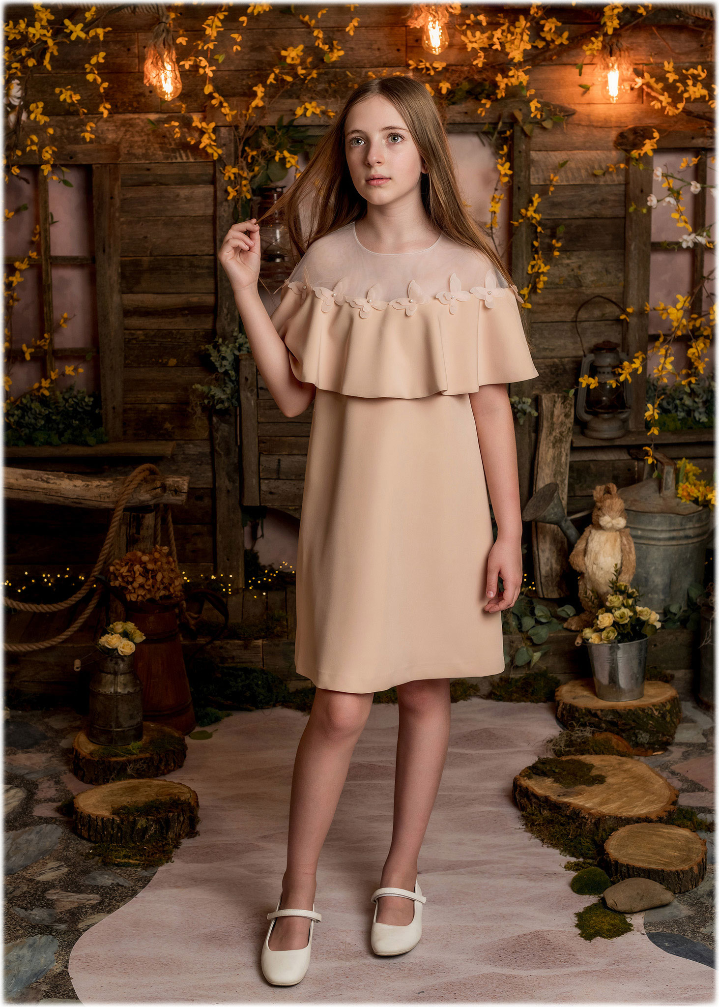 Se închide la spate cu fermoar și e accesorizată cu fluturi din organza care dau un farmec unic.
