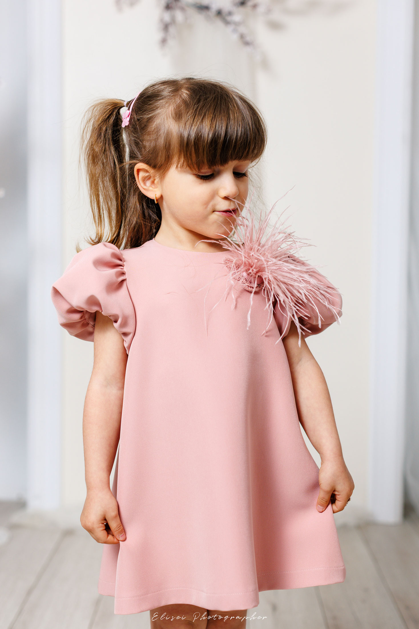 Rochie elegantă din stofă elastică subțire și fină, cu mâneci scurte bufante, are ca accesoriu o broșă. Această broșă cu pene este asortată culorii rochiei, detașabilă, care dă o notă de eleganță si glamour ținutei.