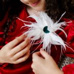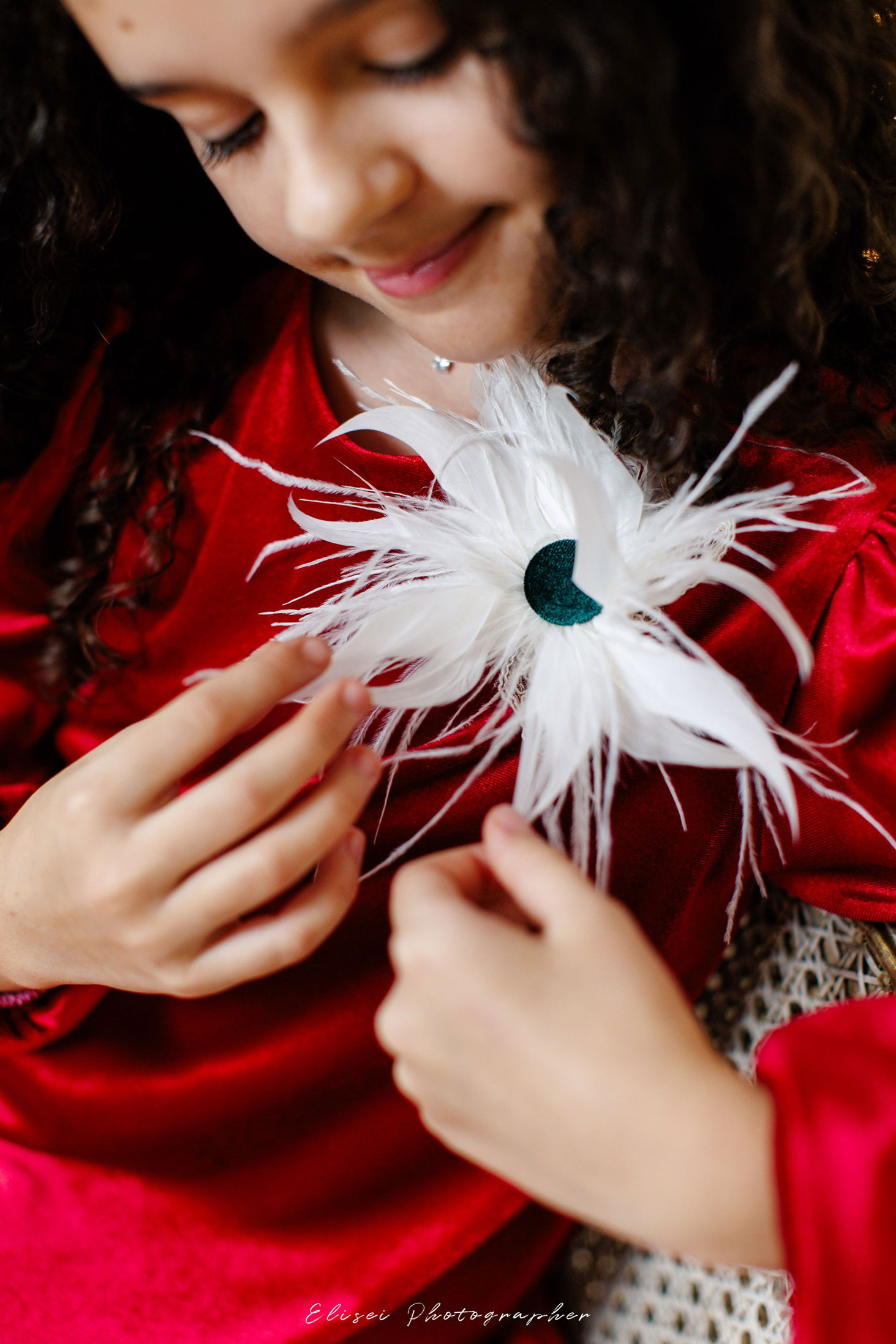Designul său fluid, ce se mulează pe siluetă, este accentuat de un accesoriu delicat – o floare din pene, care adaugă un aer sofisticat și rafinat.